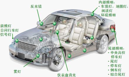 从上图中可以看出,汽车虽小但用到led灯的地方确挺多的,而且功能各不相同,颜色种类也很多,想想也只有led能够轻易满足汽车装饰照明的需求。